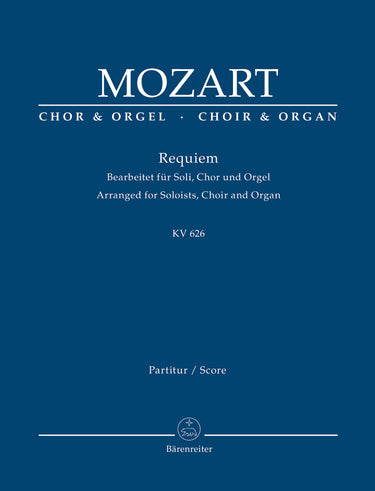 **Title**: Requiem K. 626 | **Arranged for**: Arranged for Soloists, Choir and Organ | **Composer / Author**: Mozart, Wolfgang Amadeus | **Arranger**: Focke, Martin | **Preface**: Heimbucher, Christoph | **Edition Type**: Organ reduction | **Scoring/ Instrumentation**: Soprano solo, Alto solo, Tenor solo, Bass solo, Mixed choir (SATB), Organ | **Binding**: Paperback | **Level of Difficulty**: 3.0 | **Printing**: 4th printing 2019 | **Language of Text Part**: Latin | **Weight**: 351.0 g | **Format**: 27,0 x 19,0 cm | **Pages**: 119 S. | **Language**: EN | Sample: https://data.baerenreiter.com/NB/BA/BA07518_00_9790006526338_nb_lrg_01.jpg