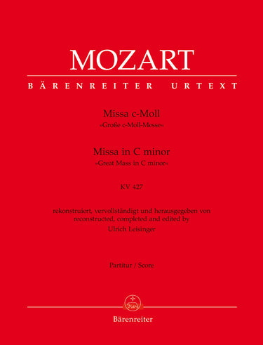 **Title**: Missa in C minor K. 427 "Great Mass in C minor" | **Comments on Version**: Reconstructed and completed by Ulrich Leisinger | **Composer / Author**: Mozart, Wolfgang Amadeus | **Editor**: Leisinger, Ulrich | **Edition Type**: Score, Urtext edition | **Scoring/ Instrumentation**: Soprano solo (2), Tenor solo, Bass solo, Mixed choirs (SATB) (2), Orchestra | **Binding**: Paperback | **Duration**: 00:55:00 | **Printing**: 1st printing 2019 | **Language of Text Part**: Latin | **Weight**: 832.0 g | **Format**: 31,0 x 24,3 cm | **Pages**: XXIII, 185 S. | **Language**: EN | Sample: https://data.baerenreiter.com/NB/BA/BA09188_00_9790006565092_nb_lrg_01.jpg
