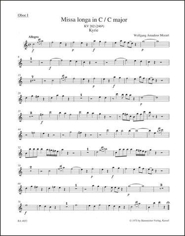 **Title**: Missa longa in C major K. 262 (246a) | **Composer / Author**: Mozart, Wolfgang Amadeus | **Editor**: Senn, Walter | **Edition Type**: Wind set, Urtext edition | **Scoring/ Instrumentation**: Oboes (2), Horns (2), Trumpets (2), Trombones (3), Timpani | **Binding**: Stapled | **Weight**: 301.0 g | **Format**: 32,5 x 25,5 cm | **Pages**: 8/8/7/7/7/7/5/8/8/8 S. | **Language**: EN | Sample: https://data.baerenreiter.com/NB/BA/BA04853_65_9790006457151_nb_lrg_01.jpg