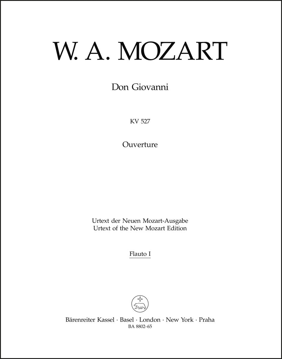 **Title**: Overture to "Don Giovanni" K. 527 | **Composer / Author**: Mozart, Wolfgang Amadeus | **Editor**: Plath, Wolfgang / Rehm, Wolfgang | **Edition Type**: Wind set, Urtext edition | **Scoring/ Instrumentation**: Flutes (2), Oboes (2), Clarinets (2), Bassoons (2), Horns (2), Trumpets (2), Timpani | **Binding**: Stapled | **Weight**: 216.0 g | **Format**: 32,5 x 25,5 cm | **Pages**: 3/3/3/3/3/3/3/3/3/3/3/3/3 S. | **Language**: EN | Sample: https://data.baerenreiter.com/NB/BA/BA08802_65_9790006524457_nb_lrg_01.jpg