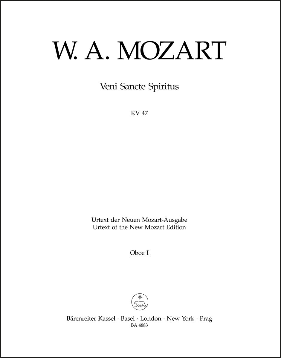 **Title**: Veni Sancte Spiritus K. 47 | **Composer / Author**: Mozart, Wolfgang Amadeus | **Editor**: Federhofer, Hellmut | **Edition Type**: Wind set, Urtext edition | **Scoring/ Instrumentation**: 1. Oboe, 2. Oboe, 1. Horn, 2. Horn, 1. Trumpet, 2. Trumpet | **Binding**: Folded | **Duration**: 00:04:00 | **Printing**: 2006 | **Weight**: 101.0 g | **Format**: 32,5 x 25,5 cm | **Pages**: 3/3/3/3/3/3/1 S. | **Language**: EN | Sample: https://data.baerenreiter.com/NB/BA/BA04883_65_9790006458745_nb_lrg_01.jpg
