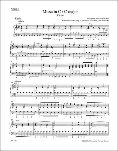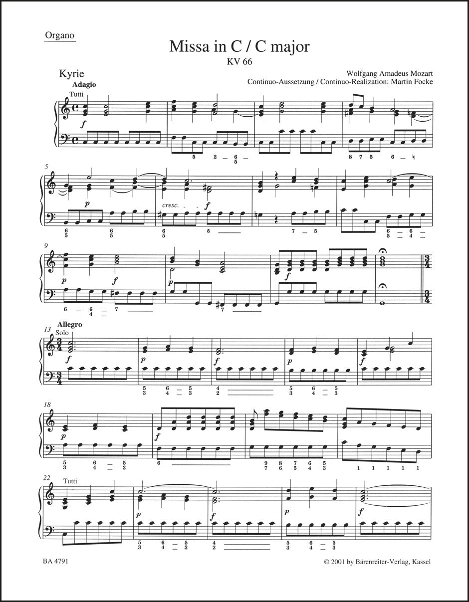 **Title**: Missa in C major K. 66 "Dominicus Mass" | **Composer / Author**: Mozart, Wolfgang Amadeus | **Editor**: Senn, Walter | **Edition Type**: Part, Urtext edition | **Scoring/ Instrumentation**: Organ | **Binding**: Stapled | **Weight**: 118.0 g | **Format**: 32,5 x 25,5 cm | **Pages**: 31 S. | **Language**: EN | Sample: https://data.baerenreiter.com/NB/BA/BA04791_67_9790006456802_nb_lrg_01.jpg