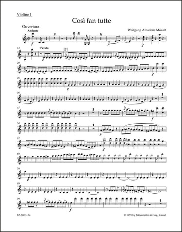 **Title**: Ouvertüre zu "Così fan tutte" KV 588 | **Composer / Author**: Mozart, Wolfgang Amadeus | **Editor**: Rehm, Wolfgang / Ferguson, Faye | **Edition Type**: Part, Urtext edition | **Scoring/ Instrumentation**: 1. Violin | **Binding**: Stapled | **Weight**: 17.0 g | **Format**: 32,5 x 25,5 cm | **Pages**: 3 S. | **Language**: EN | Sample: https://data.baerenreiter.com/NB/BA/BA08803_74_9790006524525_nb_lrg_01.jpg