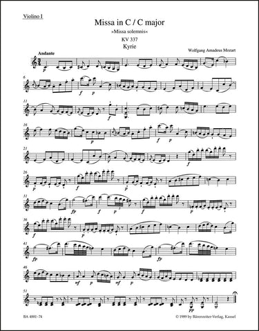 **Title**: Missa in C major K. 337 "Missa solemnis" | **Composer / Author**: Mozart, Wolfgang Amadeus | **Editor**: Holl, Monika | **Edition Type**: Part, Urtext edition | **Scoring/ Instrumentation**: 1. Violin | **Binding**: Stapled | **Weight**: 49.0 g | **Format**: 32,5 x 25,5 cm | **Pages**: 11 S. | **Language**: EN | Sample: https://data.baerenreiter.com/NB/BA/BA04881_74_9790006458608_nb_lrg_01.jpg