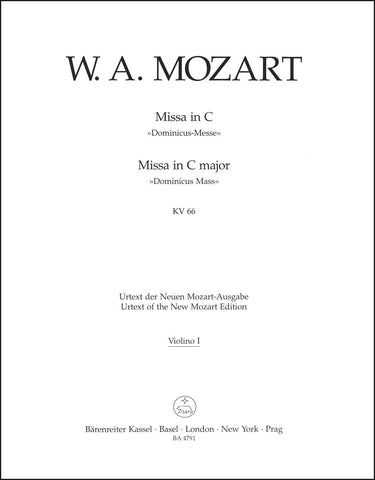 **Title**: Missa in C major K. 66 "Dominicus Mass" | **Composer / Author**: Mozart, Wolfgang Amadeus | **Editor**: Senn, Walter | **Edition Type**: Part, Urtext edition | **Scoring/ Instrumentation**: 1. Violin | **Binding**: Stapled | **Weight**: 74.0 g | **Format**: 32,5 x 25,5 cm | **Pages**: 19 S. | **Language**: EN | Sample: https://data.baerenreiter.com/NB/BA/BA04791_74_9790006456819_nb_lrg_01.jpg