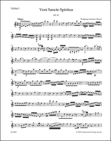 **Title**: Veni Sancte Spiritus K. 47 | **Composer / Author**: Mozart, Wolfgang Amadeus | **Editor**: Federhofer, Hellmut | **Edition Type**: Part, Urtext edition | **Scoring/ Instrumentation**: 1. Violin | **Binding**: Folded | **Duration**: 00:04:00 | **Printing**: 2006 | **Weight**: 15.0 g | **Format**: 32,5 x 25,5 cm | **Pages**: 3 S. | **Language**: EN | Sample: https://data.baerenreiter.com/NB/BA/BA04883_74_9790006458769_nb_lrg_01.jpg
