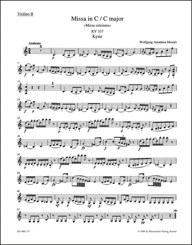 **Title**: Missa in C major K. 337 "Missa solemnis" | **Composer / Author**: Mozart, Wolfgang Amadeus | **Editor**: Holl, Monika | **Edition Type**: Part, Urtext edition | **Scoring/ Instrumentation**: 2. Violin | **Binding**: Stapled | **Weight**: 49.0 g | **Format**: 32,5 x 25,5 cm | **Pages**: 11 S. | **Language**: EN | Sample: https://data.baerenreiter.com/NB/BA/BA04881_75_9790006458615_nb_lrg_01.jpg