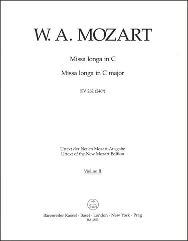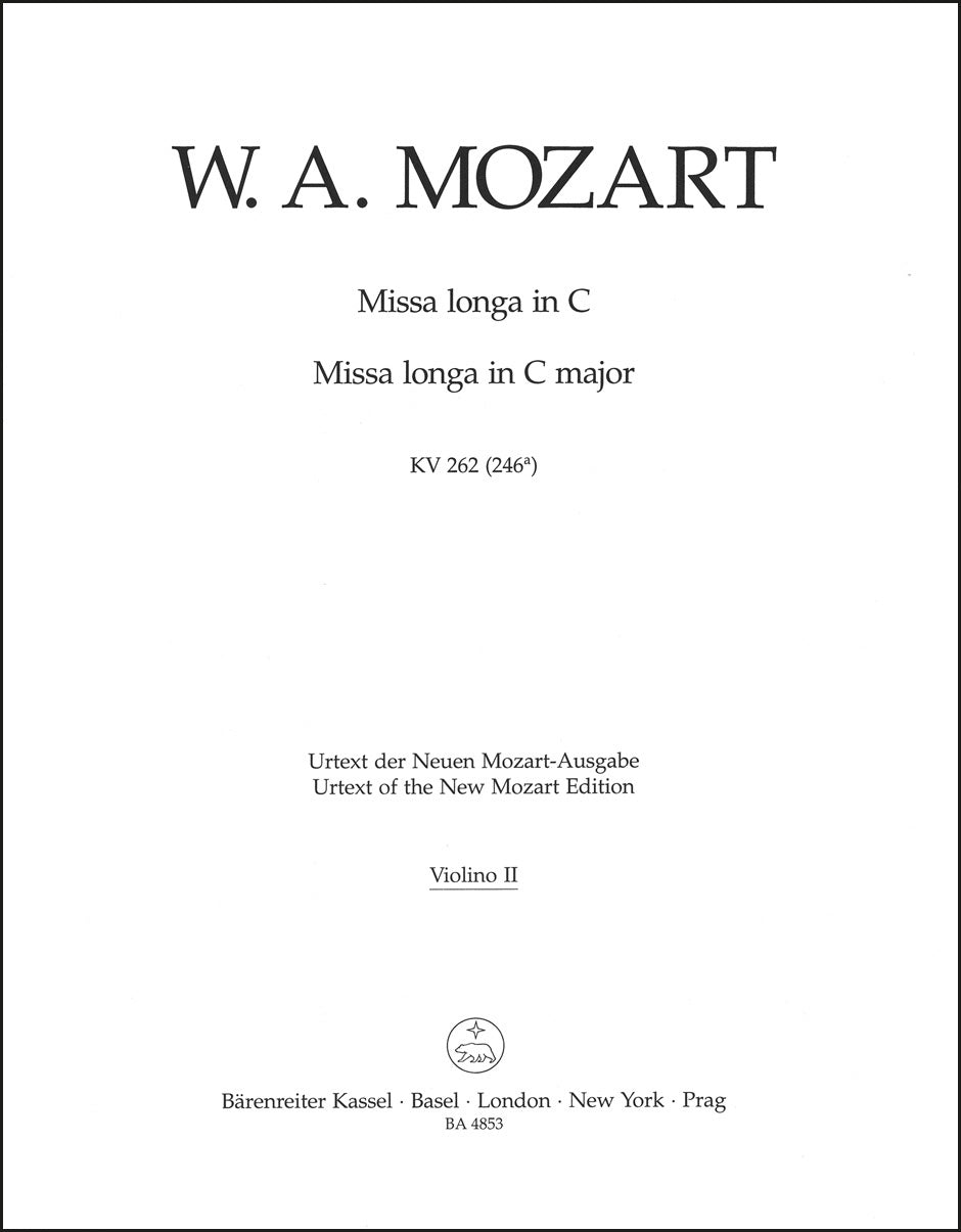 **Title**: Missa longa in C major K. 262 (246a) | **Composer / Author**: Mozart, Wolfgang Amadeus | **Editor**: Senn, Walter | **Edition Type**: Part, Urtext edition | **Scoring/ Instrumentation**: 2. Violin | **Binding**: Stapled | **Weight**: 59.0 g | **Format**: 32,5 x 25,5 cm | **Pages**: 15 S. | **Language**: EN | Sample: https://data.baerenreiter.com/NB/BA/BA04853_75_9790006457182_nb_lrg_01.jpg