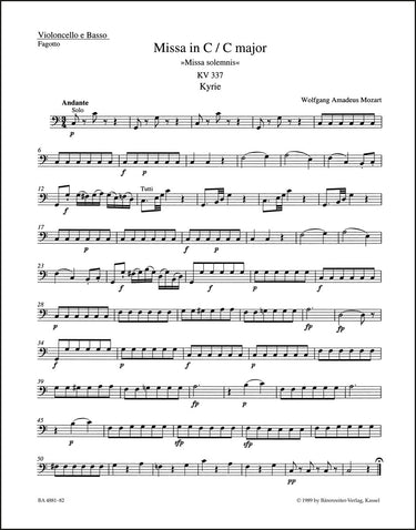 **Title**: Missa in C major K. 337 "Missa solemnis" | **Composer / Author**: Mozart, Wolfgang Amadeus | **Editor**: Holl, Monika | **Edition Type**: Part, Urtext edition | **Scoring/ Instrumentation**: Violoncello, Double bass, Bassoon | **Binding**: Stapled | **Weight**: 34.0 g | **Format**: 32,5 x 25,5 cm | **Pages**: 8 S. | **Language**: EN | Sample: https://data.baerenreiter.com/NB/BA/BA04881_82_9790006458622_nb_lrg_01.jpg