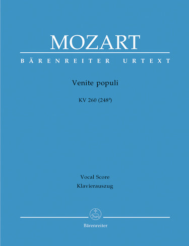 **Title**: Venite populi K. 260 (248a) | **Subtitle**: Offertorium de venerabili sacramento | **Composer / Author**: Mozart, Wolfgang Amadeus | **Arranger**: Köhs, Andreas | **Editor**: Federhofer, Hellmut | **Edition Type**: Vocal Score, Urtext edition | **Binding**: Stapled | **Level of Difficulty**: 3.0 | **Duration**: 00:05:00 | **Printing**: 3rd printing 2014 | **Weight**: 77.0 g | **Format**: 27,0 x 19,0 cm | **Pages**: 17 S. | **Language**: EN | Sample: https://data.baerenreiter.com/NB/BA/BA04899_90_9790006460168_nb_lrg_01.jpg