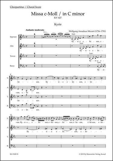 **Title**: Missa in C minor K. 427 "Great Mass in C minor" | **Comments on Version**: Reconstructed and completed by Ulrich Leisinger | **Composer / Author**: Mozart, Wolfgang Amadeus | **Editor**: Leisinger, Ulrich | **Edition Type**: Choral score, Urtext edition | **Scoring/ Instrumentation**: Mixed choirs (SATB) (2) | **Binding**: Stapled | **Language of Text Part**: Latin | **Weight**: 114.0 g | **Format**: 27,0 x 19,0 cm | **Pages**: 44 S. | **Language**: EN | Sample: https://data.baerenreiter.com/NB/BA/BA09188_91_9790006565139_nb_lrg_01.jpg