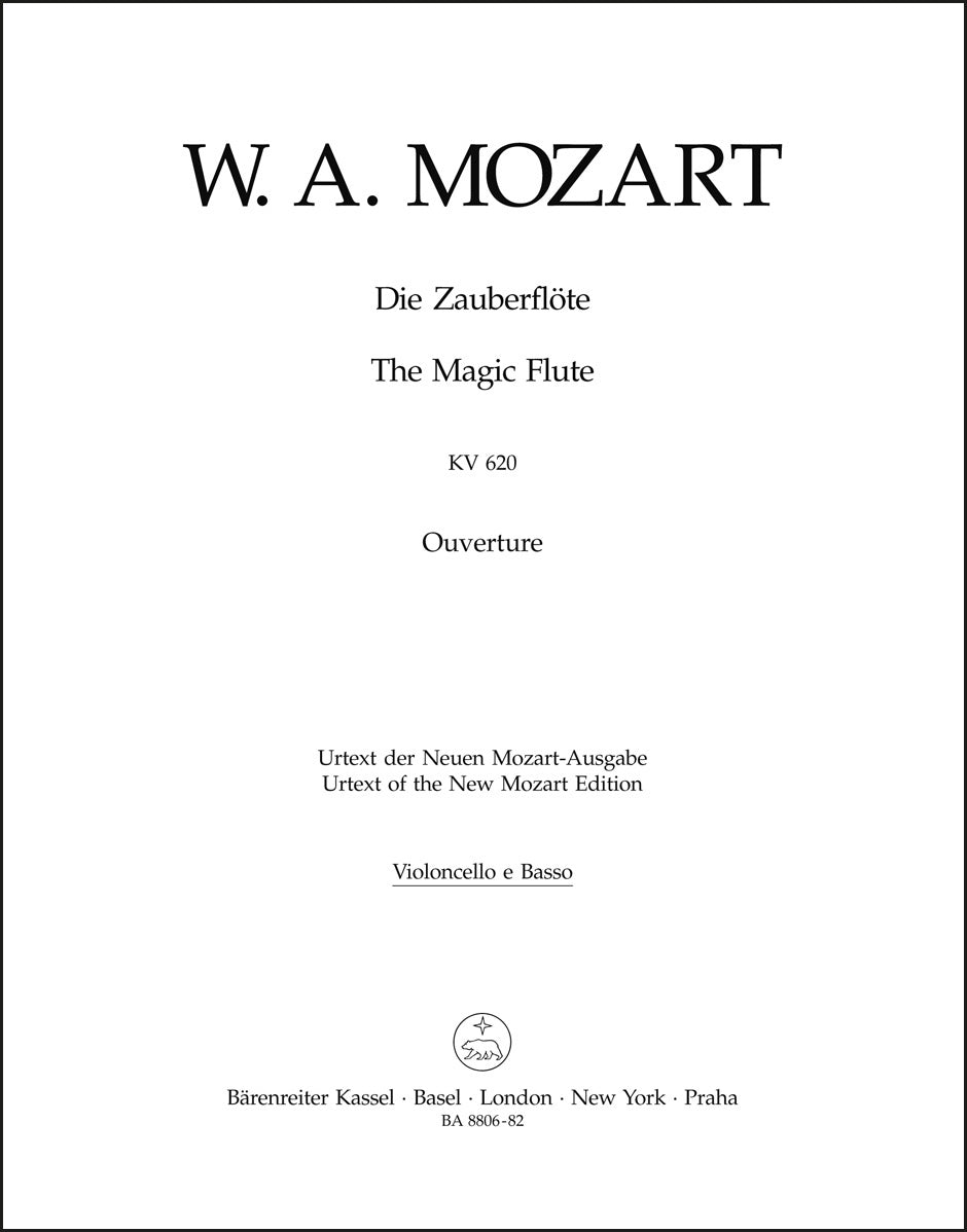 **Title**: The Magic Flute K. 620 | **Subtitle**: Overture | **Composer / Author**: Mozart, Wolfgang Amadeus | **Editor**: Orel, Alfred | **Edition Type**: Part, Urtext edition | **Scoring/ Instrumentation**: Violoncello, Double bass | **Binding**: Stapled | **Duration**: 00:07:00 | **Weight**: 17.0 g | **Format**: 32,5 x 25,5 cm | **Pages**: 4 S. | **Language**: EN | Sample: https://data.baerenreiter.com/NB/BA/BA08806_82_9790006524730_nb_lrg_01.jpg