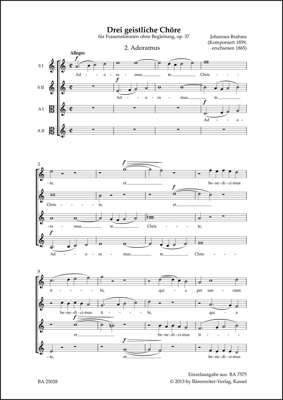 **Title**: Adoramus op. 37 no. 2 | **Misc Information**: from "Drei geistliche Chöre" for female choir a cappella | **Comments on Version**: Separate edition from: "Sacred Choral Music a cappella" (BA 7575) | **Composer / Author**: Brahms, Johannes | **Editor**: Schmitz, Peter | **Edition Type**: Choral score, Urtext edition | **Instrumentation**: Female choir | **Scoring/ Instrumentation**: Female choir (SSAA) | **Binding**: Folded | **Language of Text Part**: German | **Weight**: 13.0 g | **Format**: 29,7 x 21,0 cm | **Pages**: 3 S. | **Language**: EN | Sample: https://data.baerenreiter.com/NB/BA/BA25028_00_9790006569441_nb_lrg_01.jpg
