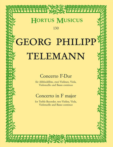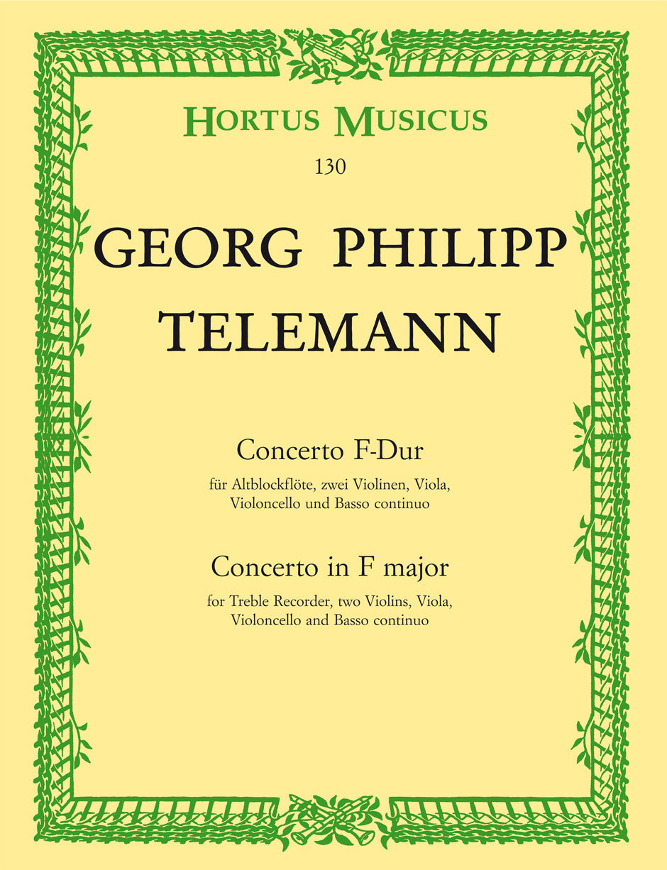 **Title**: Concerto für Altblockflöte, zwei Violinen, Viola, Violoncello und Basso continuo F-Dur TWV 51:F1 | **Composer / Author**: Telemann, Georg Philipp | **Editor**: Ruëtz, Manfred | **Edition Type**: Score | **Scoring/ Instrumentation**: Treble recorder, String orchestra | **Binding**: Stapled | **Level of Difficulty**: 3.0 | **Printing**: 11. Aufl. 2018 | **Weight**: 82.0 g | **Format**: 30,0 x 23,0 cm | **Pages**: 16 S. | **Language**: EN | Sample: https://data.baerenreiter.com/NB/HM/HM00130_00_9790006002658_nb_lrg_01.jpg