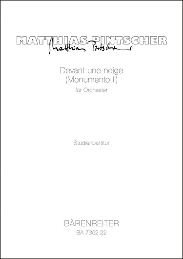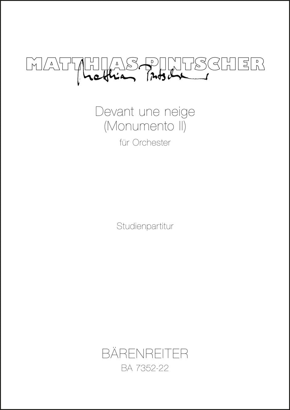 **Title**: Devant une neige - Monumento II für Orchester (1993) | **Comments**: Uraufführung 28.11.1993, Darmstadt | **Composer / Author**: Pintscher, Matthias | **Edition Type**: Study score | **Instrumentation**: Orchestra | **Binding**: Stapled | **Duration**: 00:23:00 | **Printing**: 4. Aufl. 2014 | **Weight**: 396.0 g | **Format**: 41,7 x 29,3 cm | **Pages**: 51 S. | **Language**: EN | Sample: https://data.baerenreiter.com/NB/BA/BA07352_22_9790006494002_nb_lrg_01.jpg