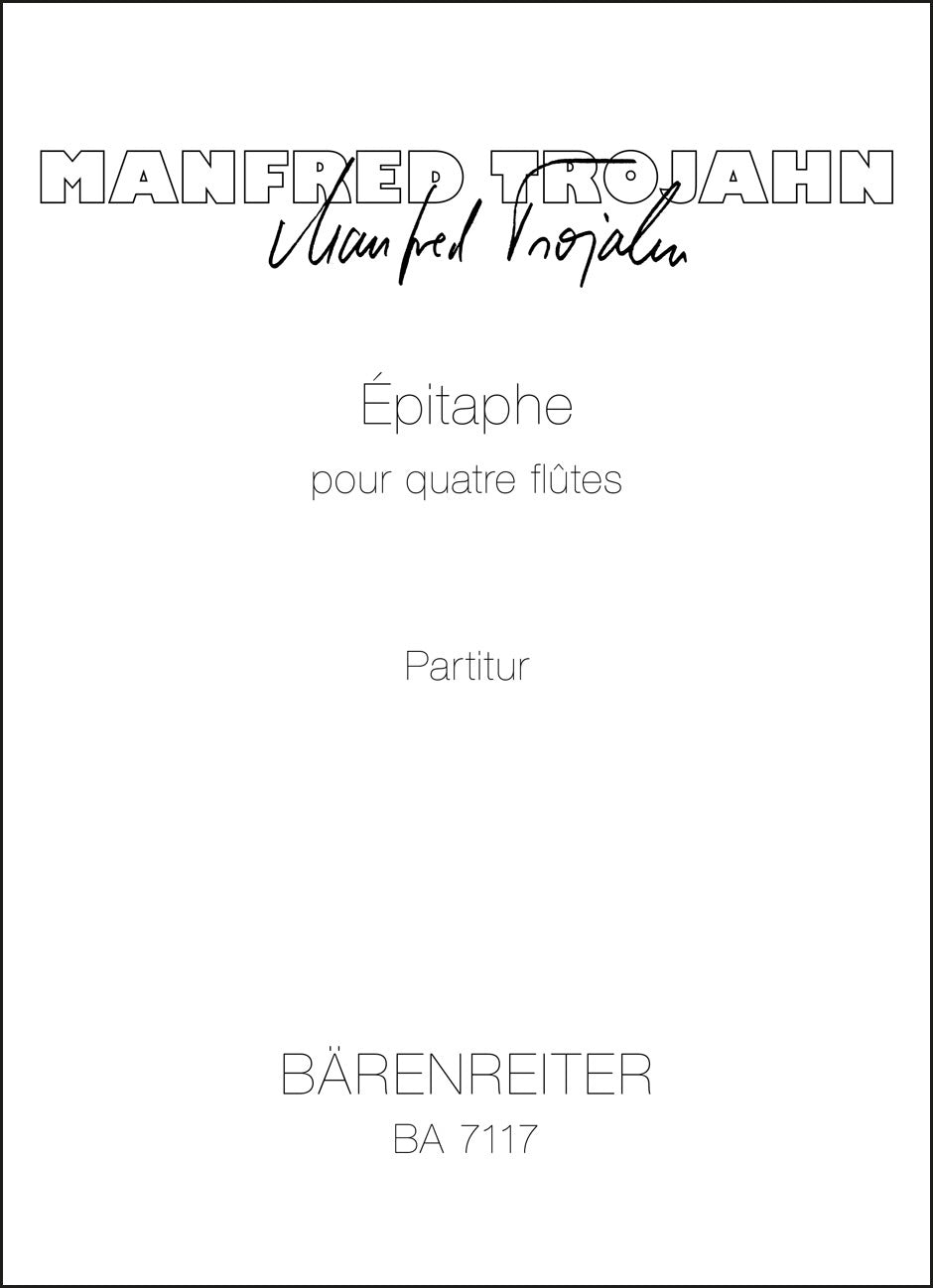 **Title**: Épitaphe for four Flutes (1986) | **Composer / Author**: Trojahn, Manfred | **Edition Type**: Score | **Instrumentation**: Flute | **Scoring/ Instrumentation**: Flutes (4) | **Binding**: Stapled | **Duration**: 00:12:00 | **Printing**: 9th printing 2012 | **Weight**: 55.0 g | **Format**: 29,0 x 20,8 cm | **Pages**: 12 S. | **Language**: EN | Sample: https://data.baerenreiter.com/NB/BA/BA07117_00_9790006485529_nb_lrg_01.jpg