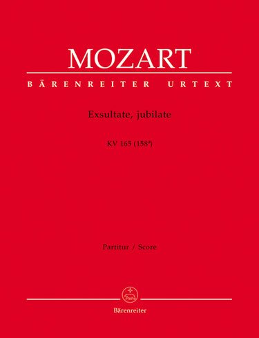 **Title**: Exsultate, jubilate K. 165 (158a) | **Subtitle**: Motet | **Comments on Version**: Edited with additional material from the Salzburg version | **Composer / Author**: Mozart, Wolfgang Amadeus | **Editor**: Federhofer, Hellmut / Münster, Robert | **Edition Type**: Score, Urtext edition | **Scoring/ Instrumentation**: Soprano solo, Orchestra | **Binding**: Stapled | **Level of Difficulty**: 3.0 | **Duration**: 00:17:00 | **Printing**: 7th printing 2019 | **Weight**: 150.0 g | **Format**: 31,0 x 24,3 cm | **Pages**: V, 20 S. | **Language**: EN | Sample: https://data.baerenreiter.com/NB/BA/BA04897_00_9790006459933_nb_lrg_01.jpg