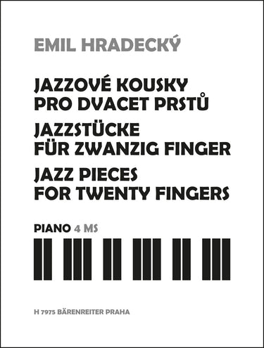 **Title**: Jazzstücke für zwanzig Finger | **Composer / Author**: Hradecký, Emil | **Edition Type**: Performance score | **Instrumentation**: Piano (4 hands) | **Scoring/ Instrumentation**: Piano (4 hands) | **Weight**: 199.0 g | **Format**: 31,0 x 23,5 cm | **Pages**: 36 S. | **Language**: EN | Sample: https://data.baerenreiter.com/NB/H/H07975_00_9790260109353_nb_lrg_01.jpg