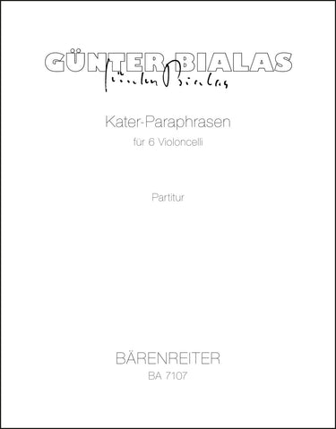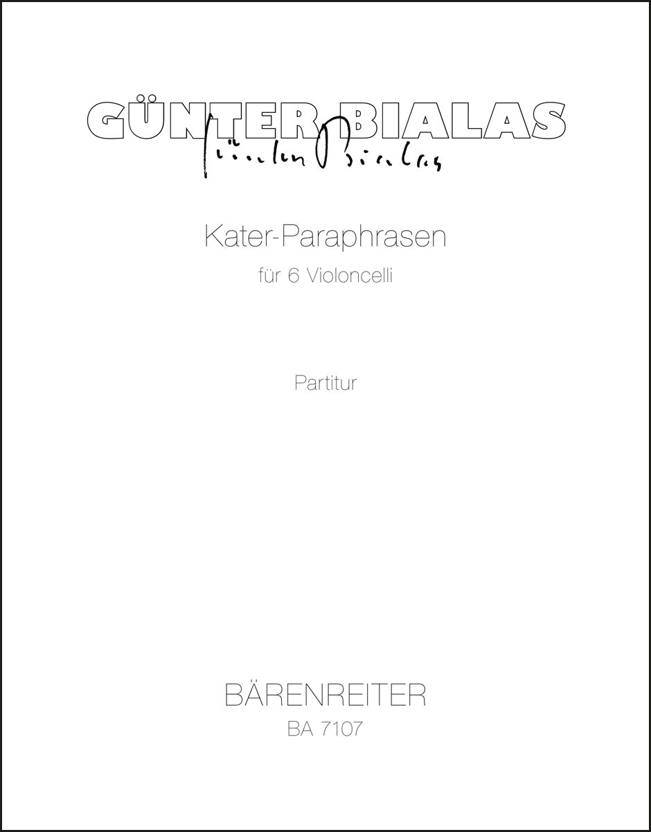 **Title**: Kater-Paraphrasen für 6 Violoncelli (1978) | **Misc Information**: nach Motiven aus der Oper "Der gestiefelte Kater" | **Composer / Author**: Bialas, Günter | **Edition Type**: Score | **Instrumentation**: Violoncello | **Scoring/ Instrumentation**: Violoncellos (6) | **Binding**: Stapled | **Level of Difficulty**: 4.0 | **Weight**: 142.0 g | **Format**: 34,4 x 27,2 cm | **Pages**: 19 S. | **Language**: EN | Sample: https://data.baerenreiter.com/NB/BA/BA07107_00_9790006485406_nb_lrg_01.jpg