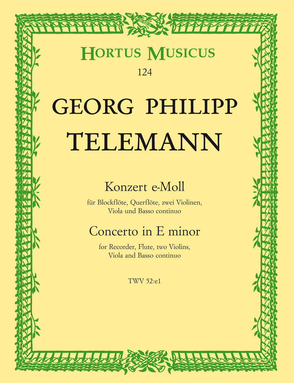 **Title**: Konzert für Blockflöte, Querflöte, zwei Violinen, Viola und Basso continuo e-Moll TWV 52:e1 | **Comments on Version**: Generalbass-Bearbeitung von Otto Kiel | **Composer / Author**: Telemann, Georg Philipp | **Editor**: Kölbel, Herbert | **Edition Type**: Score | **Scoring/ Instrumentation**: Treble recorder, Flute, Violins (2), Viola, Basso continuo | **Binding**: Stapled | **Level of Difficulty**: 4.0 | **Printing**: 20. Aufl. 2020 | **Weight**: 126.0 g | **Format**: 30,0 x 23,0 cm | **Pages**: 27 S. | **Language**: EN | Sample: https://data.baerenreiter.com/NB/HM/HM00124_00_9790006002542_nb_lrg_01.jpg