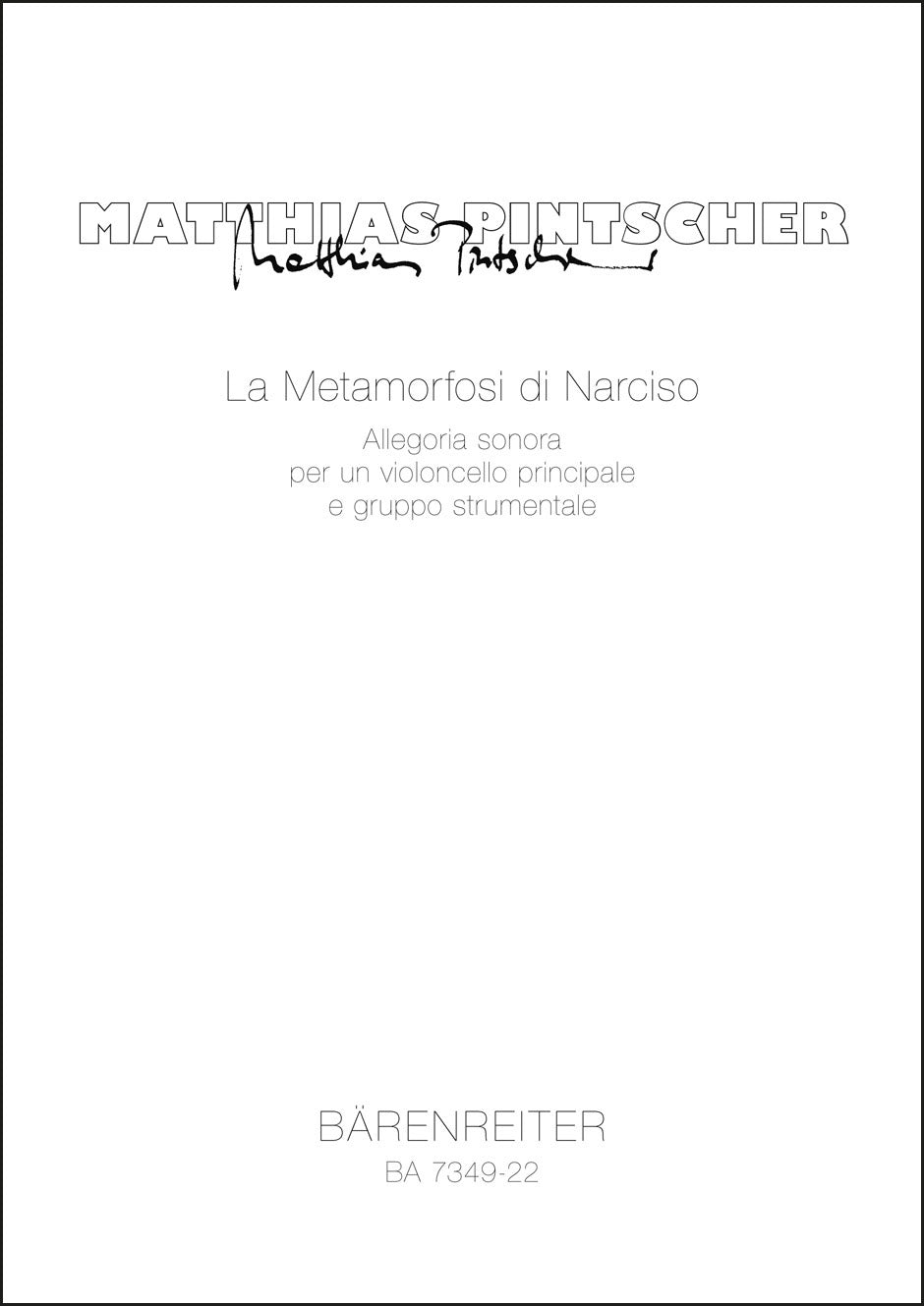 **Title**: La Metamorfosi di Narciso (1992) | **Subtitle**: Allegoria sonora per un violoncello principale e gruppo strumentale | **Comments**: Uraufführung 25.02.1993, Hamburg | **Composer / Author**: Pintscher, Matthias | **Edition Type**: Study score | **Binding**: Stapled | **Duration**: 00:36:00 | **Printing**: 4. Aufl. 2011 | **Weight**: 457.0 g | **Format**: 42,0 x 29,5 cm | **Pages**: 62 S. | **Language**: EN | Sample: https://data.baerenreiter.com/NB/BA/BA07349_22_9790006493951_nb_lrg_01.jpg