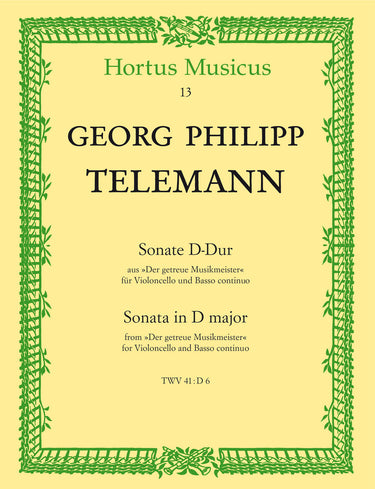 **Title**: Sonata für Violoncello und Basso continuo in D major TWV 41:D6 | **Misc Information**: from "Der getreue Musikmeister" | **Composer / Author**: Telemann, Georg Philipp | **Editor**: Degen, Johannes Dietz | **Preface**: Degen, Johannes Dietz | **Edition Type**: Performance score, Part | **Instrumentation**: Violoncello, Basso continuo | **Scoring/ Instrumentation**: Violoncello, Basso continuo | **Binding**: Stapled | **Level of Difficulty**: 3.0 | **Grade (UK)**: 8 | **Printing**: 17th printing 2023 | **Weight**: 89.0 g | **Format**: 30,0 x 23,0 cm | **Pages**: 10/3/2 S. | **Language**: EN | Sample: https://data.baerenreiter.com/NB/HM/HM00013_00_9790006000159_nb_lrg_01.jpg