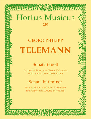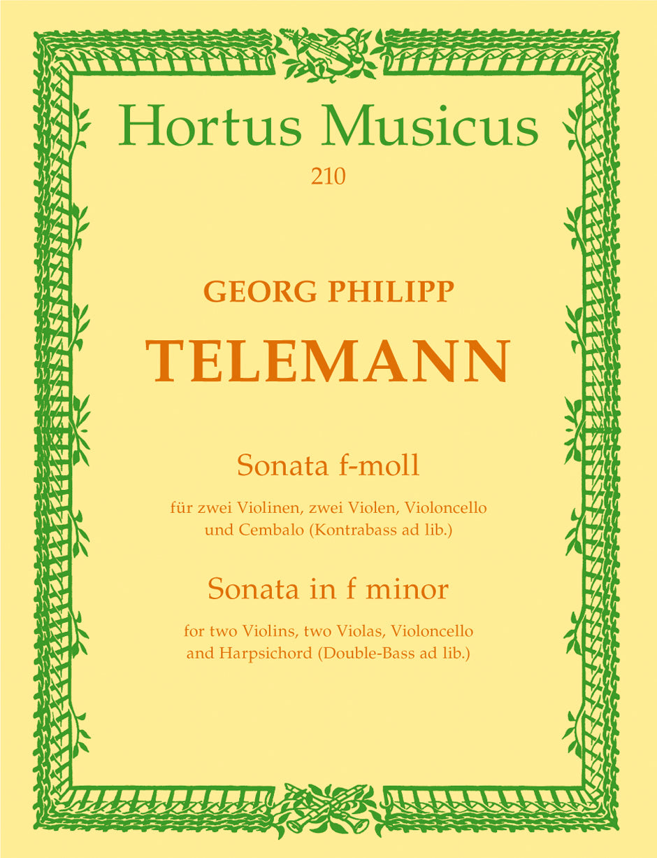 **Title**: Sonate für 2 Violinen, 2 Violen, Violoncello und Basso continuo f-Moll TWV 44:32 | **Subtitle**: Sextett | **Composer / Author**: Telemann, Georg Philipp | **Editor**: Hofmann, Klaus | **Edition Type**: Score | **Instrumentation**: String sextet | **Scoring/ Instrumentation**: Violins (2), Violas (2), Violoncello, Basso continuo | **Binding**: Stapled | **Level of Difficulty**: 3.0 | **Weight**: 120.0 g | **Format**: 22,1 x 29,0 cm | **Pages**: 25 S. | **Language**: EN | Sample: https://data.baerenreiter.com/NB/HM/HM00210_00_9790006004140_nb_lrg_01.jpg