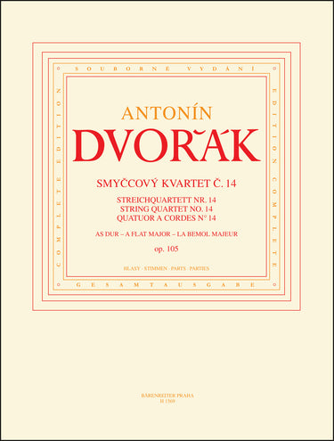 **Title**: String Quartet no. 14 in A-flat major op. 105 | **Composer / Author**: Dvorak, Antonin | **Edition Type**: Set of parts | **Instrumentation**: String quartet | **Scoring/ Instrumentation**: Violins (2), Viola, Violoncello | **Binding**: in a folder | **Weight**: 258.0 g | **Format**: 31,0 x 23,5 cm | **Pages**: 16/16/16/16 S. | **Language**: EN | Sample: https://data.baerenreiter.com/NB/H/H01569_00_9790260105652_nb_lrg_01.jpg