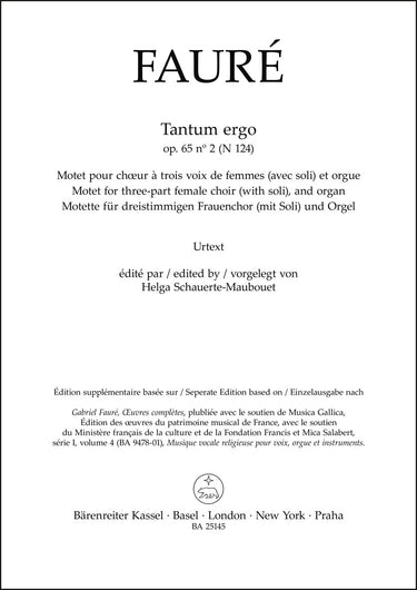 **Title**: Tantum ergo op. 65/2 N 124 | **Subtitle**: Motet for three-part Female Choir (with soloists) and Organ | **Composer / Author**: Fauré, Gabriel | **Editor**: Schauerte-Maubouet, Helga | **Edition Type**: Choral score, Urtext edition | **Scoring/ Instrumentation**: Female choir (SSA), Organ | **Binding**: Folded | **Level of Difficulty**: 3.0 | **Printing**: 1st printing 2021 | **Language of Text Part**: Latin | **Weight**: 13.0 g | **Format**: 29,7 x 21,0 cm | **Pages**: 4 S. | **Language**: EN | Sample: https://data.baerenreiter.com/NB/BA/BA25145_00_9790006575114_nb_lrg_01.jpg