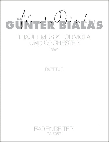 **Title**: Trauermusik (1994) | **Composer / Author**: Bialas, Günter | **Edition Type**: Score | **Scoring/ Instrumentation**: Viola solo, Orchestra | **Binding**: Paperback | **Duration**: 00:16:00 | **Weight**: 166.0 g | **Format**: 30,0 x 23,0 cm | **Pages**: 48 S. | **Language**: EN | Sample: https://data.baerenreiter.com/NB/BA/BA07357_00_9790006487394_nb_lrg_01.jpg