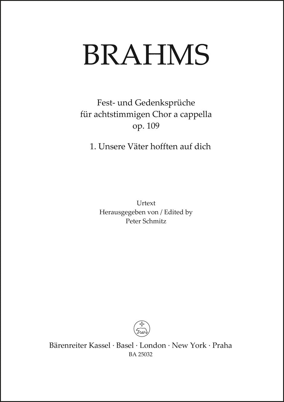 **Title**: Unsere Väter hofften auf dich op. 109 no. 1 | **Misc Information**: from "Fest- und Gedenksprüche" for 8-part choir a cappella | **Comments on Version**: Separate edition from: "Sacred Choral Music a cappella" (BA 7575) | **Composer / Author**: Brahms, Johannes | **Editor**: Schmitz, Peter | **Edition Type**: Choral score, Urtext edition | **Instrumentation**: Choir | **Scoring/ Instrumentation**: Mixed choirs (SATB) (2) | **Binding**: Stapled | **Language of Text Part**: German | **Weight**: 25.0 g | **Format**: 29,7 x 21,0 cm | **Pages**: 7 S. | **Language**: EN | Sample: https://data.baerenreiter.com/NB/BA/BA25032_00_9790006569489_nb_lrg_01.jpg