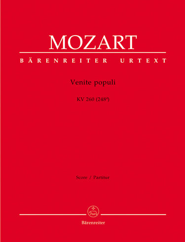 **Title**: Venite populi K. 260 (248a) | **Subtitle**: Offertorium de venerabili sacramento | **Composer / Author**: Mozart, Wolfgang Amadeus | **Editor**: Federhofer, Hellmut | **Edition Type**: Score, Urtext edition | **Scoring/ Instrumentation**: Mixed choir, Orchestra | **Binding**: Stapled | **Level of Difficulty**: 3.0 | **Duration**: 00:05:00 | **Weight**: 130.0 g | **Format**: 31,0 x 24,3 cm | **Pages**: 24 S. | **Language**: EN | Sample: https://data.baerenreiter.com/NB/BA/BA04899_00_9790006460106_nb_lrg_01.jpg