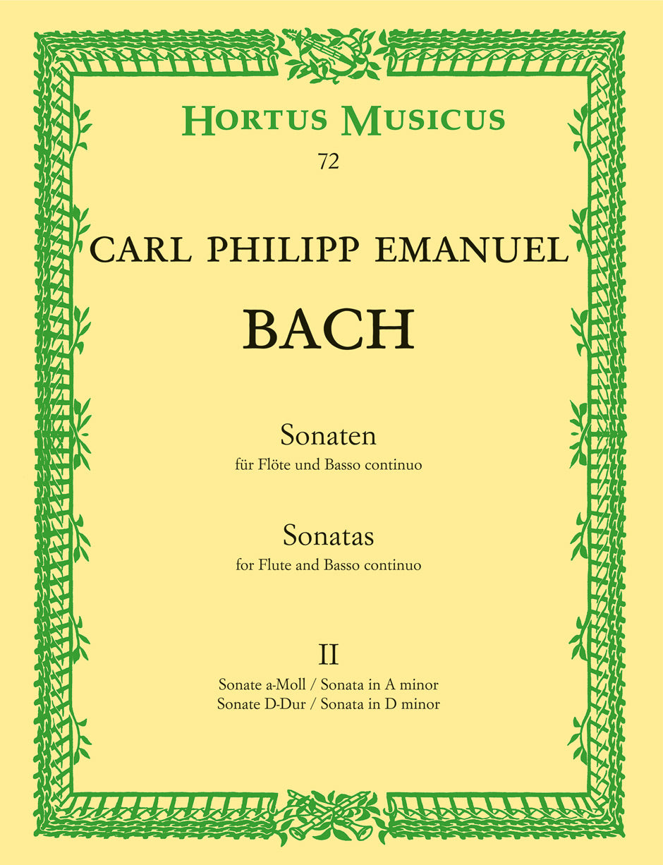 **Title**: Sonatas for Flute and Basso continuo | **Subtitle**: Sonatas in A minor Wq 128 and D major Wq 131 | **Misc Information**: Volume 2 | **Composer / Author**: Bach, Carl Philipp Emanuel | **Editor**: Walther, Kurt | **Edition Type**: Performance score, Set of parts | **Instrumentation**: Flute, Basso continuo | **Scoring/ Instrumentation**: Flute, Basso continuo | **Binding**: Stapled | **Level of Difficulty**: 3.0 | **Printing**: 13th printing 2024 | **Weight**: 166.0 g | **Format**: 30,0 x 23,0 cm | **Pages**: 20/8/6 S. | **Language**: EN | Sample: https://data.baerenreiter.com/NB/HM/HM00072_00_9790006001378_nb_lrg_01.jpg