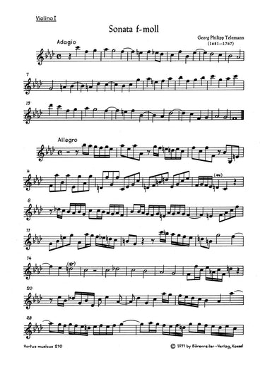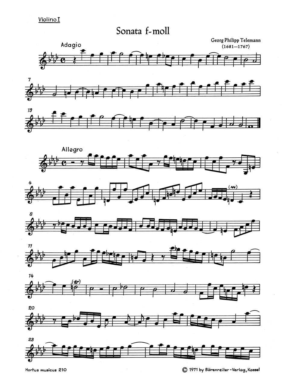 **Title**: Sonate für 2 Violinen, 2 Violen, Violoncello und Basso continuo f-Moll TWV 44:32 | **Subtitle**: Sextett | **Composer / Author**: Telemann, Georg Philipp | **Editor**: Hofmann, Klaus | **Edition Type**: Part | **Instrumentation**: String sextet | **Scoring/ Instrumentation**: 1. Violin | **Binding**: Stapled | **Weight**: 10.0 g | **Format**: 29,0 x 21,0 cm | **Pages**: 5 S. | **Language**: EN | Sample: https://data.baerenreiter.com/NB/HM/HM00210_74_9790006004157_nb_lrg_01.jpg