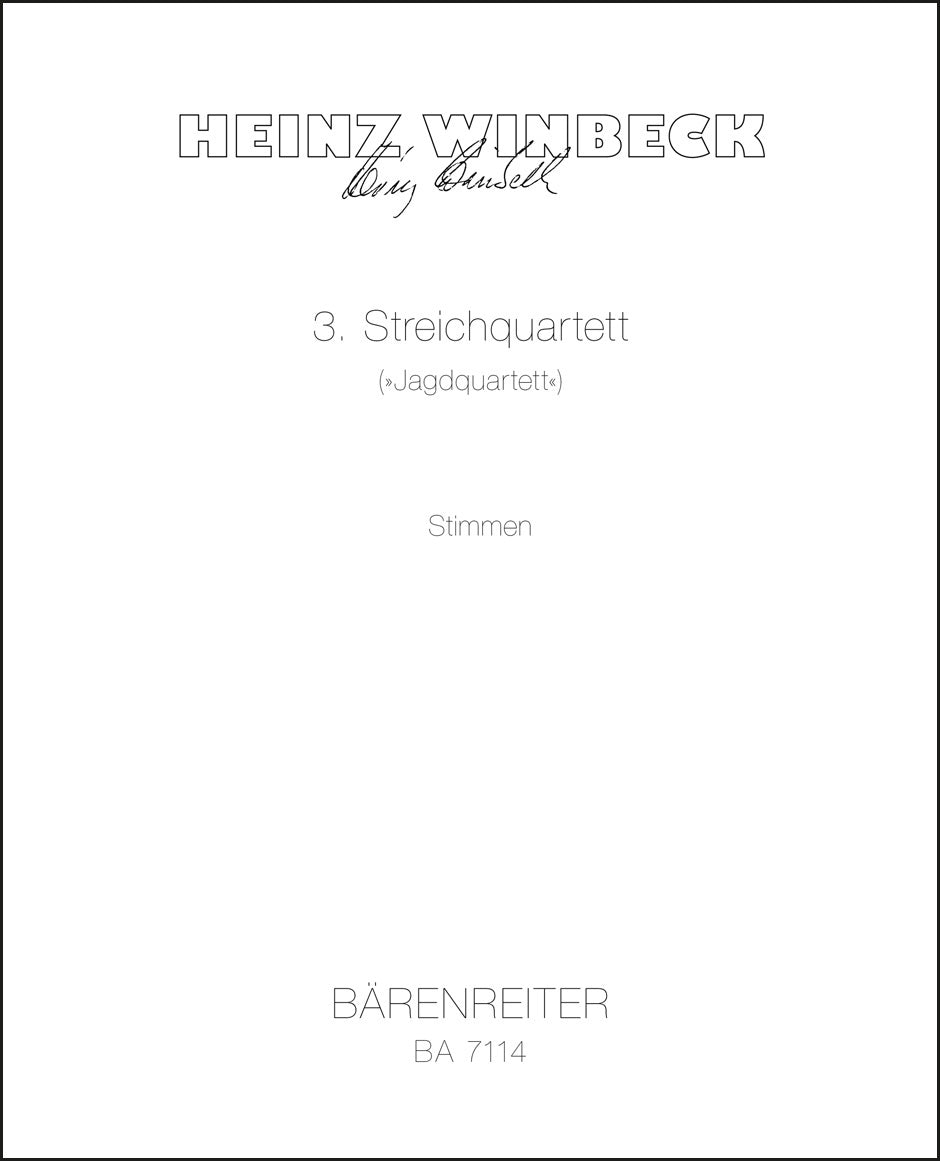 **Title**: Streichquartett no. 3 "Jagdquartett" (1983/1984) | **Comments**: Uraufführung 12.10.1984, Hamburg | **Composer / Author**: Winbeck, Heinz | **Edition Type**: Set of parts | **Instrumentation**: String quartet | **Scoring/ Instrumentation**: Violins (2), Viola, Violoncello | **Binding**: Stapled | **Duration**: 00:25:00 | **Weight**: 240.0 g | **Format**: 42,0 x 29,6 cm | **Pages**: 8/8/8/8 S. | **Language**: EN | Sample: https://data.baerenreiter.com/NB/BA/BA07114_22_9790006485499_nb_lrg_01.jpg