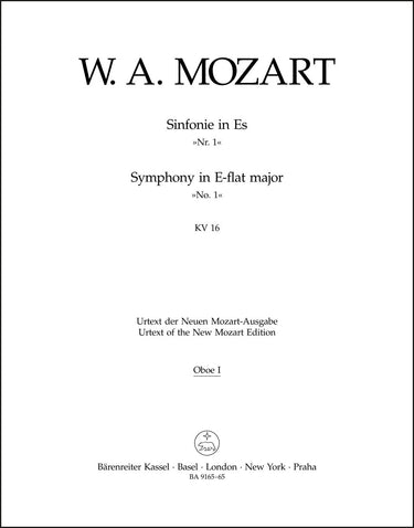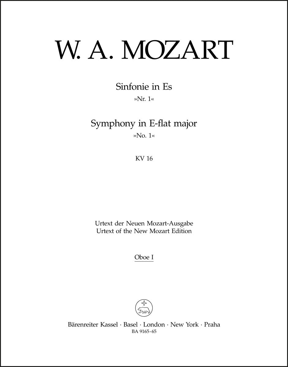**Title**: Symphony no. 1 in E-flat major K. 16 | **Composer / Author**: Mozart, Wolfgang Amadeus | **Editor**: Allroggen, Gerhard | **Edition Type**: Wind set, Urtext edition | **Scoring/ Instrumentation**: 1. Oboe, 2. Oboe, 1. Horn, 2. Horn | **Binding**: Folded | **Weight**: 70.0 g | **Format**: 32,5 x 25,5 cm | **Pages**: 4/4/3/3 S. | **Language**: EN | Sample: https://data.baerenreiter.com/NB/BA/BA09165_65_9790006528028_nb_lrg_01.jpg
