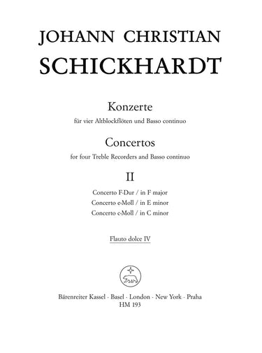 **Title**: Sechs Konzerte für 4 Altblockflöten und Basso continuo | **Subtitle**: Konzerte F-dur, e-moll und c-moll | **Misc Information**: Heft 2 | **Composer / Author**: Schickhardt, Johann Christian | **Editor**: Knab, Richard, Valentin | **Edition Type**: Part | **Scoring/ Instrumentation**: 4. Treble recorder | **Binding**: Paperback | **Weight**: 30.0 g | **Format**: 29,0 x 21,0 cm | **Pages**: 9 S. | **Language**: EN | Sample: https://data.baerenreiter.com/NB/HM/HM00193_26_9790006003891_nb_lrg_01.jpg