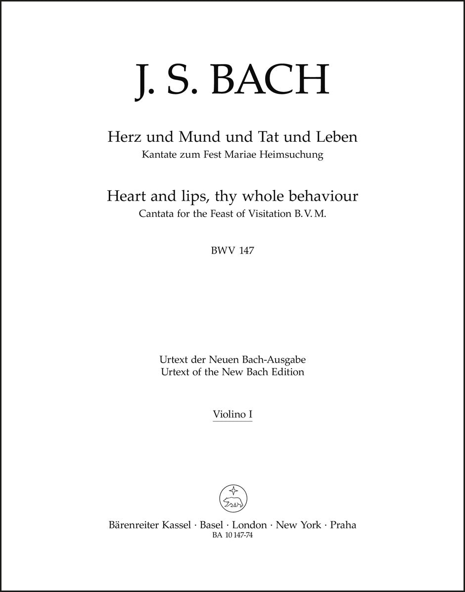 **Title**: Heart and lips, thy whole behaviour BWV 147 | **Subtitle**: Cantata for the Feast of Visitation B. V. M. | **Comments on Version**: Study score = TP 1147 | **Composer / Author**: Bach, Johann Sebastian | **Editor**: Wolf, Uwe | **Edition Type**: Part, Urtext edition | **Scoring/ Instrumentation**: 1. Violin | **Binding**: Stapled | **Weight**: 33.0 g | **Format**: 32,5 x 25,5 cm | **Pages**: 8 S. | **Language**: EN | Sample: https://data.baerenreiter.com/NB/BA/BA10147_74_9790006499687_nb_lrg_01.jpg