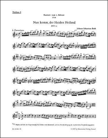 **Title**: Nun komm, der Heiden Heiland BWV 61 | **Subtitle**: Cantata for the First Sunday of Advent | **Comments on Version**: Study score = TP 1061 | **Composer / Author**: Bach, Johann Sebastian | **Editor**: Dürr, Alfred | **Edition Type**: Part, Urtext edition | **Scoring/ Instrumentation**: 1. Violin | **Binding**: Folded | **Weight**: 16.0 g | **Format**: 32,5 x 25,5 cm | **Pages**: 4 S. | **Language**: EN | Sample: https://data.baerenreiter.com/NB/BA/BA10061_74_9790006490264_nb_lrg_01.jpg