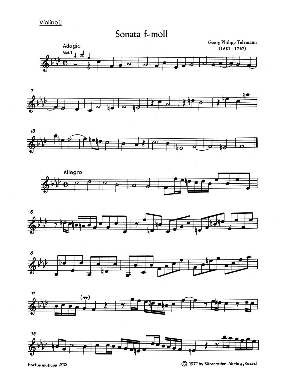 **Title**: Sonate für 2 Violinen, 2 Violen, Violoncello und Basso continuo f-Moll TWV 44:32 | **Subtitle**: Sextett | **Composer / Author**: Telemann, Georg Philipp | **Editor**: Hofmann, Klaus | **Edition Type**: Part | **Instrumentation**: String sextet | **Scoring/ Instrumentation**: 2. Violin | **Binding**: Stapled | **Weight**: 12.0 g | **Format**: 29,0 x 21,0 cm | **Pages**: 5 S. | **Language**: EN | Sample: https://data.baerenreiter.com/NB/HM/HM00210_75_9790006004164_nb_lrg_01.jpg