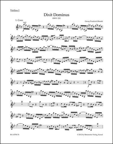 **Title**: Dixit Dominus HWV 232 | **Misc Information**: Psalm 109 | **Comments**: Replaces BA 4002-70 | **Composer / Author**: Handel, George Frideric | **Editor**: Marx, Hans Joachim | **Edition Type**: Part, Urtext edition | **Scoring/ Instrumentation**: 1. Violin | **Binding**: Stapled | **Weight**: 68.0 g | **Format**: 32,5 x 25,5 cm | **Pages**: 13 S. | **Language**: EN | Sample: https://data.baerenreiter.com/NB/BA/BA10704_74_9790006526529_nb_lrg_01.jpg