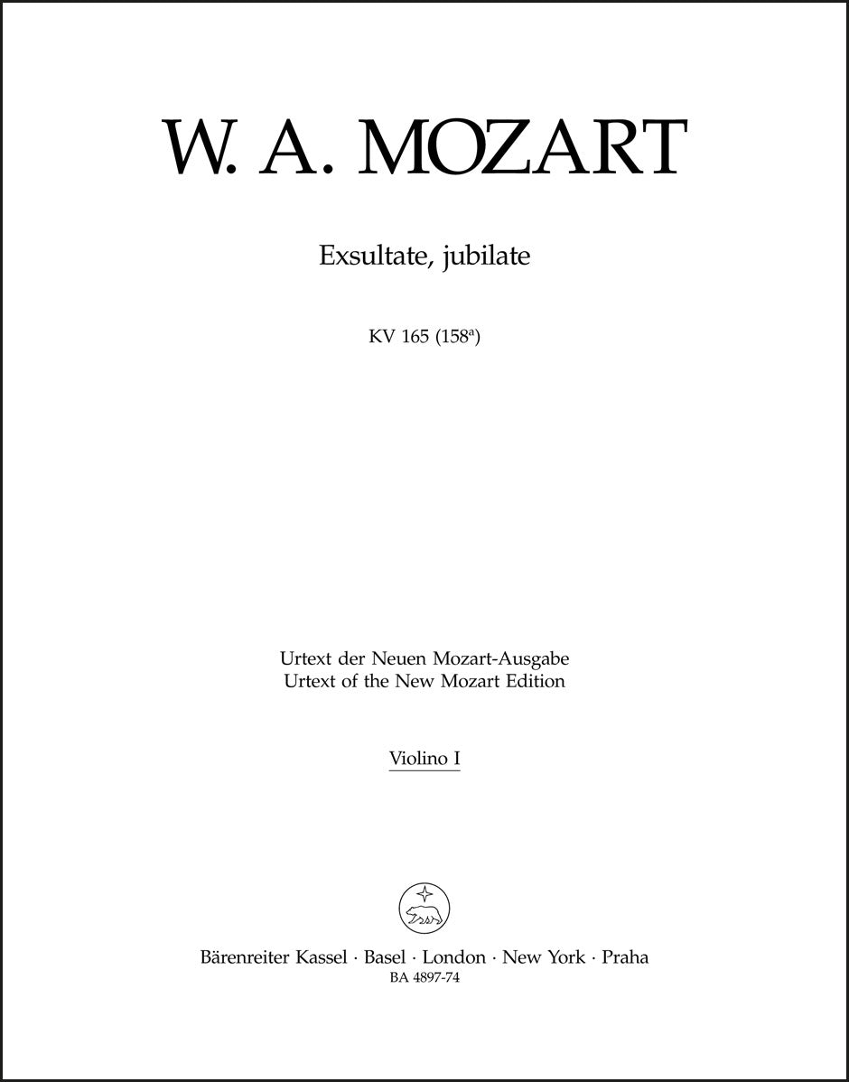 **Title**: Exsultate, jubilate K. 165 (158a) | **Subtitle**: Motet | **Comments on Version**: Edited with additional material from the Salzburg version | **Composer / Author**: Mozart, Wolfgang Amadeus | **Editor**: Federhofer, Hellmut / Münster, Robert | **Edition Type**: Part, Urtext edition | **Scoring/ Instrumentation**: 1. Violin | **Binding**: Stapled | **Weight**: 33.0 g | **Format**: 32,5 x 25,5 cm | **Pages**: 7 S. | **Language**: EN | Sample: https://data.baerenreiter.com/NB/BA/BA04897_74_9790006459964_nb_lrg_01.jpg