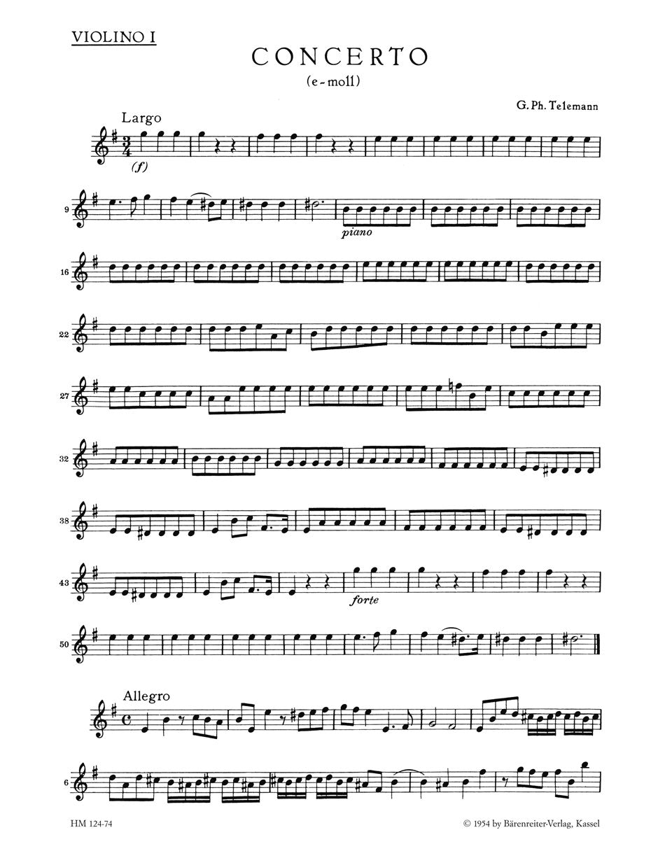 **Title**: Konzert für Blockflöte, Querflöte, zwei Violinen, Viola und Basso continuo e-Moll TWV 52:e1 | **Composer / Author**: Telemann, Georg Philipp | **Editor**: Kölbel, Herbert | **Edition Type**: Part | **Scoring/ Instrumentation**: 1. Violin | **Binding**: Folded | **Weight**: 14.0 g | **Format**: 30,0 x 23,0 cm | **Pages**: 5 S. | **Language**: EN | Sample: https://data.baerenreiter.com/NB/HM/HM00124_74_9790006002573_nb_lrg_01.jpg