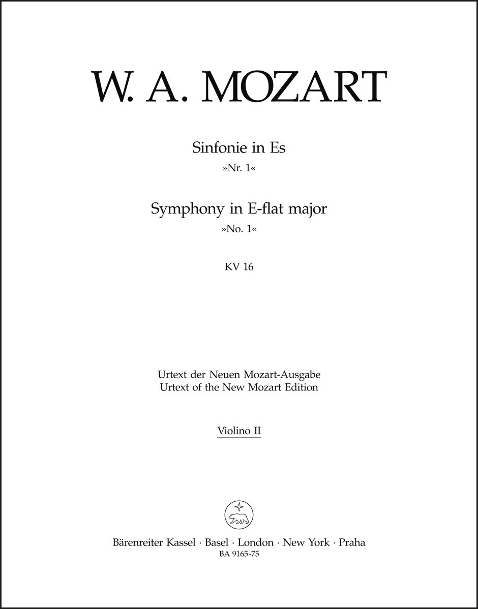 **Title**: Symphony no. 1 in E-flat major K. 16 | **Composer / Author**: Mozart, Wolfgang Amadeus | **Editor**: Allroggen, Gerhard | **Edition Type**: Part, Urtext edition | **Scoring/ Instrumentation**: 2. Violin | **Binding**: Stapled | **Weight**: 33.0 g | **Format**: 32,5 x 25,5 cm | **Pages**: 7 S. | **Language**: EN | Sample: https://data.baerenreiter.com/NB/BA/BA09165_75_9790006528042_nb_lrg_01.jpg