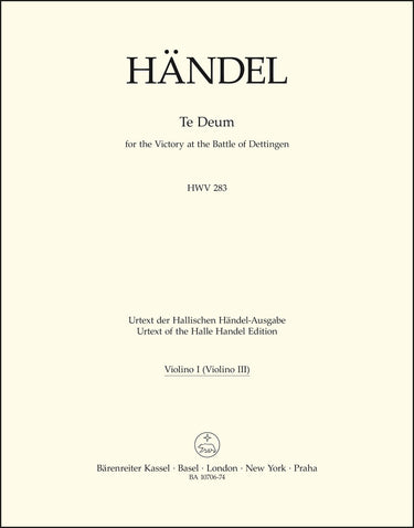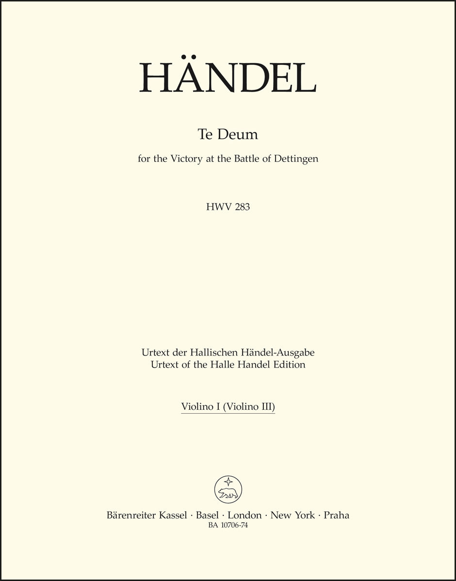 **Title**: Te Deum for the Victory at the Battle of Dettingen HWV 283 | **Composer / Author**: Handel, George Frideric | **Editor**: Babington, Amanda | **Edition Type**: Part, Urtext edition | **Scoring/ Instrumentation**: 1. Violin (3. Violin) | **Binding**: Stapled | **Weight**: 67.0 g | **Format**: 32,5 x 25,5 cm | **Pages**: 15 S. | **Language**: EN | Sample: https://data.baerenreiter.com/NB/BA/BA10706_74_9790006544394_nb_lrg_01.jpg