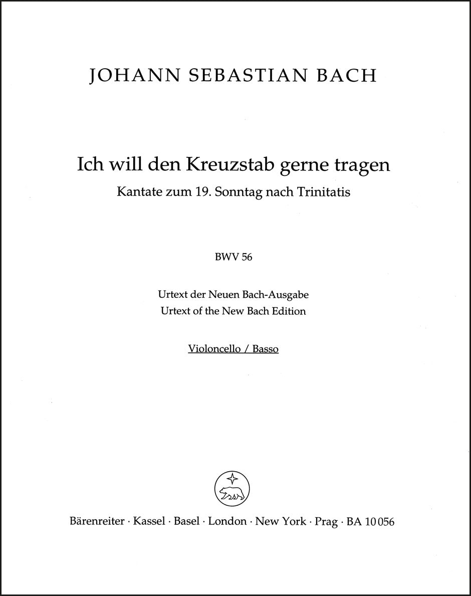 **Title**: I will my cross-staff gladly carry BWV 56 "Cross Staff Cantata (Kreuzstabkantate)" | **Subtitle**: Cantata for the 19th Sunday after Trinity | **Comments on Version**: Study score = TP 1056 | **Composer / Author**: Bach, Johann Sebastian | **Editor**: Wendt, Matthias | **Edition Type**: Part, Urtext edition | **Scoring/ Instrumentation**: Violoncello, Double bass | **Binding**: Stapled | **Duration**: 00:21:00 | **Weight**: 30.0 g | **Format**: 32,5 x 25,5 cm | **Pages**: 7 S. | **Language**: EN | Sample: https://data.baerenreiter.com/NB/BA/BA10056_82_9790006503308_nb_lrg_01.jpg