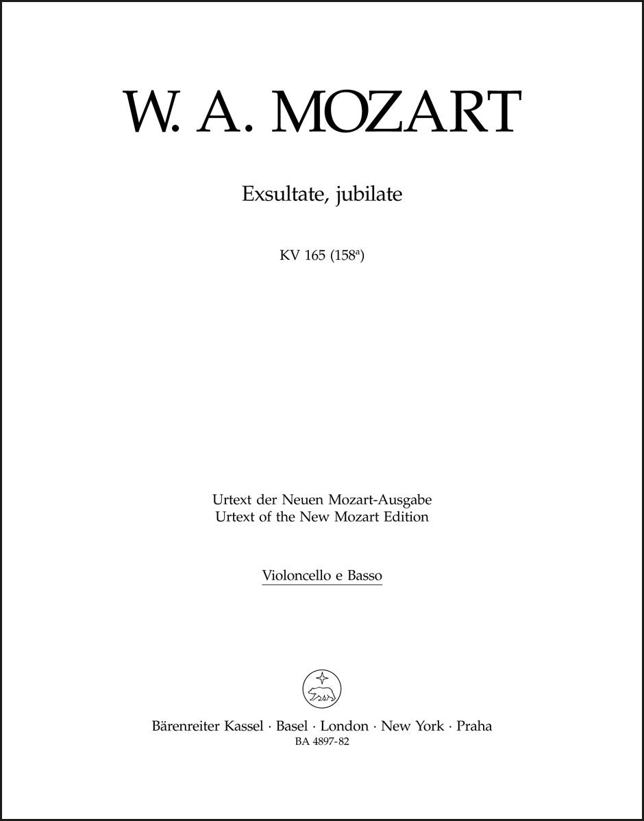 **Title**: Exsultate, jubilate K. 165 (158a) | **Subtitle**: Motet | **Comments on Version**: Edited with additional material from the Salzburg version | **Composer / Author**: Mozart, Wolfgang Amadeus | **Editor**: Federhofer, Hellmut / Münster, Robert | **Edition Type**: Part, Urtext edition | **Scoring/ Instrumentation**: Violoncello, Double bass, Bassoon | **Binding**: Stapled | **Weight**: 34.0 g | **Format**: 32,5 x 25,5 cm | **Pages**: 7 S. | **Language**: EN | Sample: https://data.baerenreiter.com/NB/BA/BA04897_82_9790006459995_nb_lrg_01.jpg
