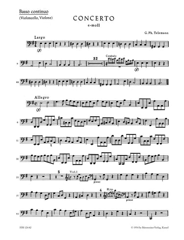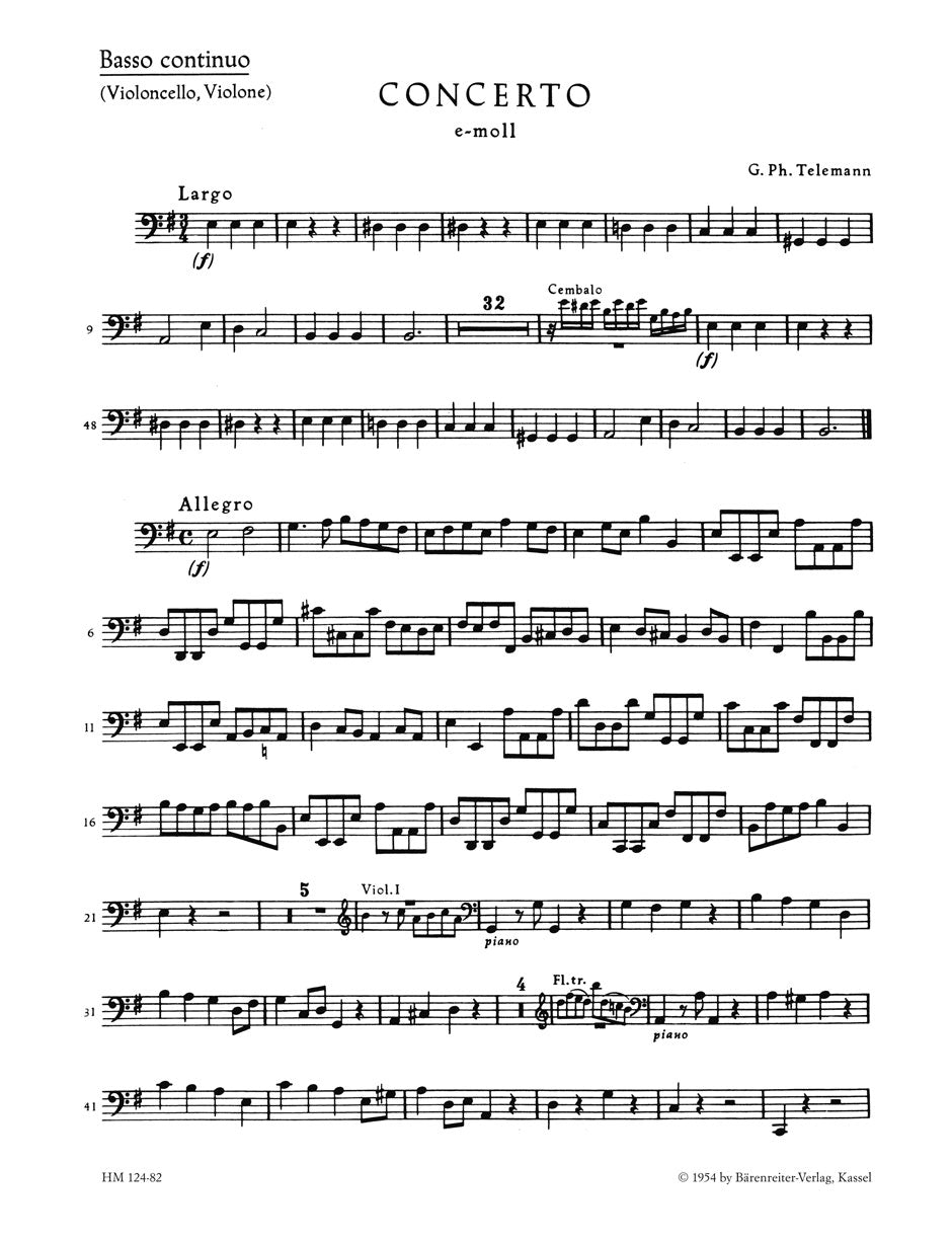 **Title**: Konzert für Blockflöte, Querflöte, zwei Violinen, Viola und Basso continuo e-Moll TWV 52:e1 | **Composer / Author**: Telemann, Georg Philipp | **Editor**: Kölbel, Herbert | **Edition Type**: Part | **Scoring/ Instrumentation**: Violoncello, Double bass | **Binding**: Stapled | **Weight**: 14.0 g | **Format**: 30,0 x 23,0 cm | **Pages**: 4 S. | **Language**: EN | Sample: https://data.baerenreiter.com/NB/HM/HM00124_82_9790006002603_nb_lrg_01.jpg
