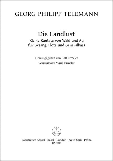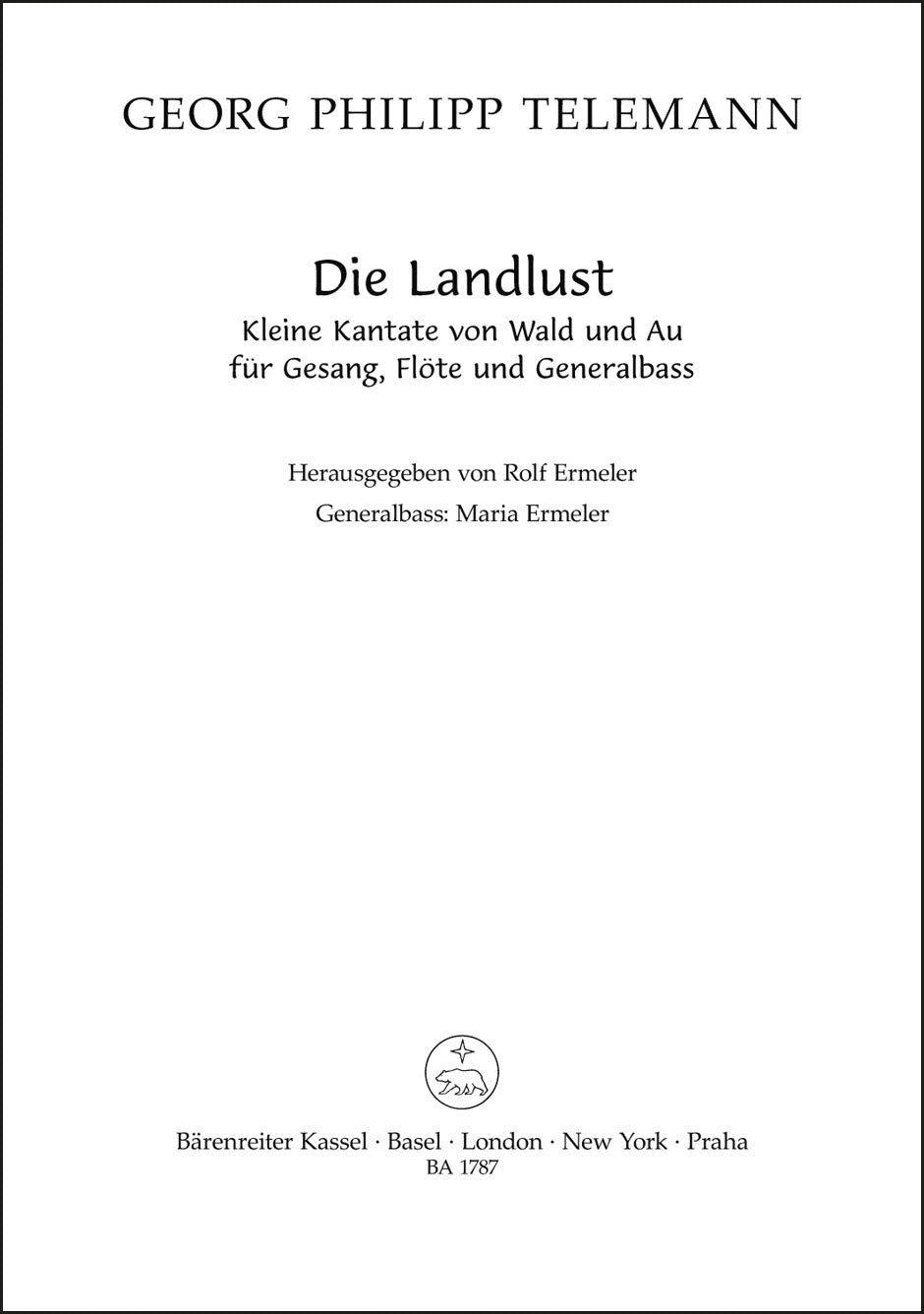 **Title**: Die Landlust | **Subtitle**: Kleine Kantate von Wald und Au | **Misc Information**: aus Moralische Kantaten III | **Comments**: Der Partitur liegen Instrumentalstimmen bei | **Comments on Version**: Generalbass: Maria Ermeler | **Composer / Author**: Telemann, Georg Philipp | **Editor**: Ermeler, Rolf | **Edition Type**: Singing Score, Part | **Instrumentation**: Flute, Basso continuo | **Scoring/ Instrumentation**: Medium voice, Flute, Basso continuo | **Binding**: Stapled | **Printing**: 14. Aufl. 2012 | **Language of Text Part**: German | **Weight**: 90.0 g | **Format**: 27,0 x 19,0 cm | **Pages**: 12/1/3 S. | **Language**: EN | Sample: https://data.baerenreiter.com/NB/BA/BA01787_00_9790006414208_nb_lrg_01.jpg