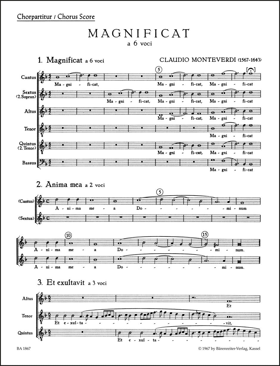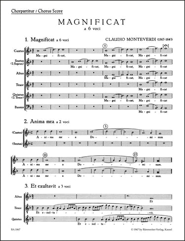 **Title**: Magnificat | **Subtitle**: Lobgesang der Maria | **Composer / Author**: Monteverdi, Claudio | **Editor**: Matthaei, Karl | **Edition Type**: Choral score | **Scoring/ Instrumentation**: Mixed choir: SSATTB | **Binding**: Stapled | **Language of Text Part**: Latin | **Weight**: 42.0 g | **Format**: 30,0 x 23,0 cm | **Pages**: 11 S. | **Language**: EN | Sample: https://data.baerenreiter.com/NB/BA/BA01867_91_9790006414871_nb_lrg_01.jpg